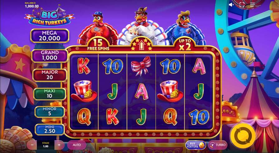 При работе над Big Rich Turkeys провайдер Red Tiger реализовал несколько видов бонусных игр и много дополнительных функций. Благодаря этому, гемблер гарантированно получит незабываемые ощущения и сможет забрать крупный максвин в размере 20000x. За основу авторы взяли сеттинг Дня Благодарения. Поэтому в процессе игры гемблер познакомится с тремя забавными индейками.
